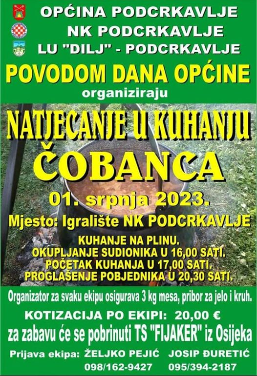 Općina Podcrkavlje, NK Podcrkavlje i LU “Dilj” Podcrkavlje povodom dana Općine organiziraju Natjecanje u kuhanju čobanca, 1. srpnja 2023. godine na igralištu NK Podcrkavlje